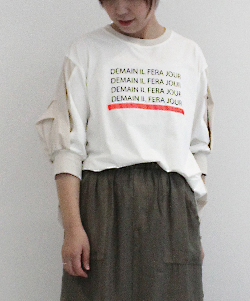 布帛の配色使いがカットソーだけどブラウスっぽさもある1枚。