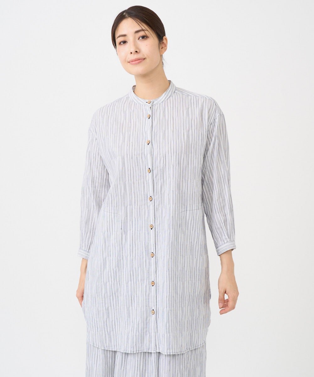 ロングブラウスは、ドロップショルダーとバンドカラーのデザインで、すっきりとした印象を与えます。後身頃のギャザーと裾のラウンドが甘さを添え、カジュアルにもフォーマルにも幅広くコーディネート可能。