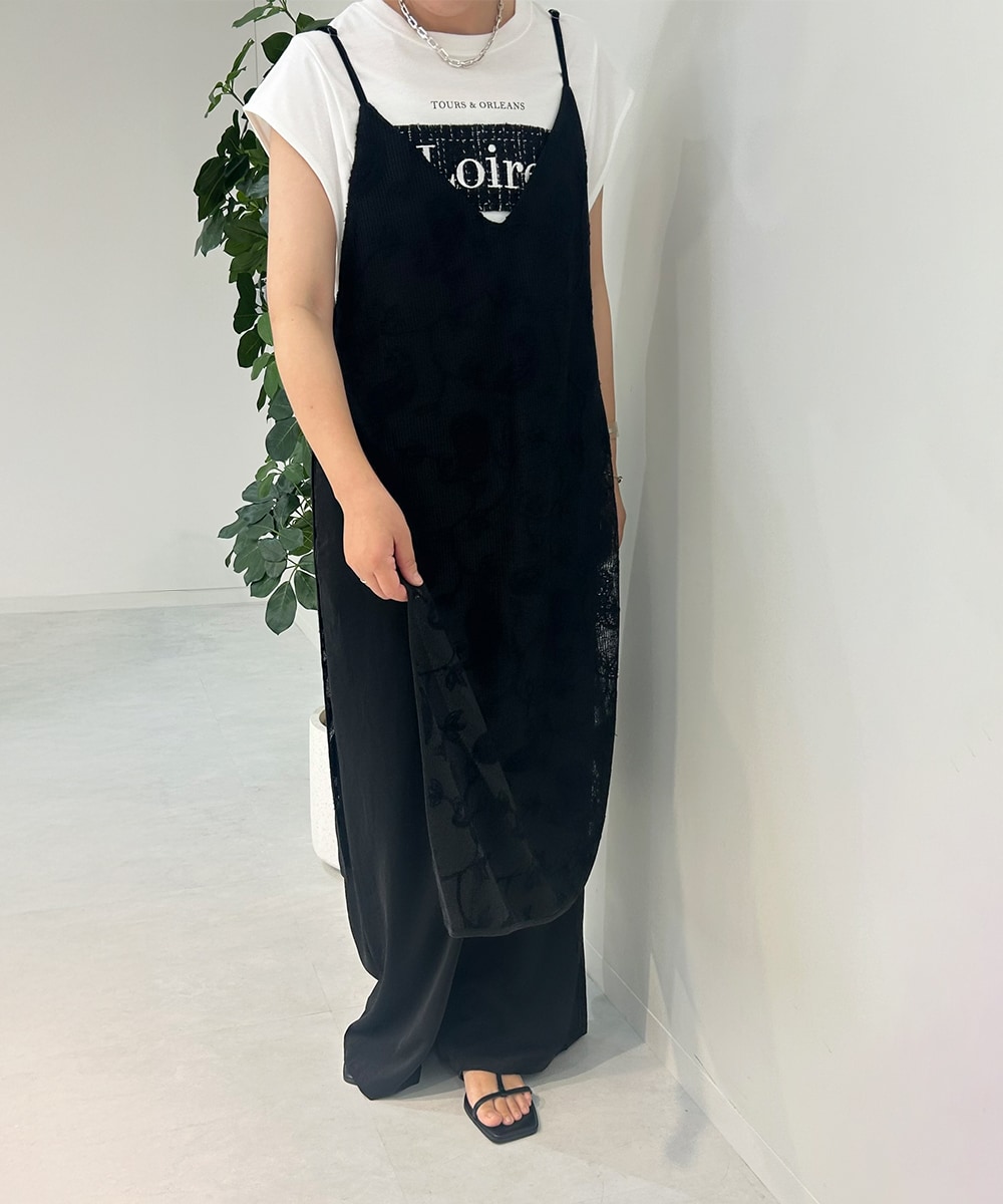 柄レースのキャミワンピースをレイヤードしたようなサロペット。 1枚でトレンドのレイヤースタイルが完成。 ドッキング仕様で着崩れせずリラックスしてご着用いただけます。 黒を着用。 サロペット(パンツ)部分はとろみのある軽やかな素材感。 華奢なストラップラインが女性らしくすっきり。 深めのV明きがインナーをお楽しみいただけるカットライン。 合わせるインナーはツイードを張り付けたようなロゴプリント。 白を着用。 フレンチスリーブが気になる二の腕もカバーしてくれます。 マチ付きの脇が見えないデザインも嬉しいポイント。