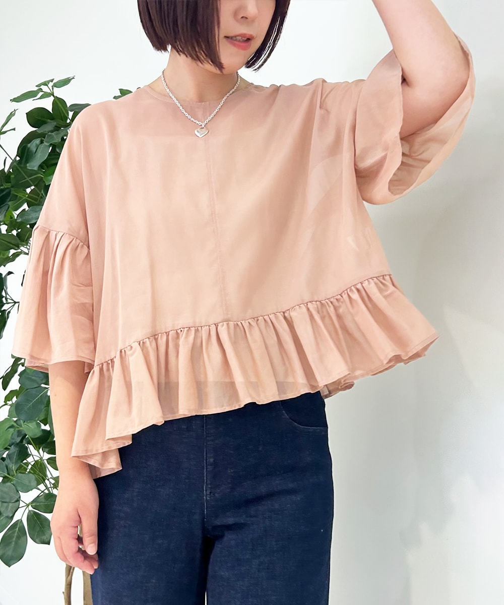 ふんわり広がるペプラムデザインが身体のラインをカバーしつつフェミニンな印象に。