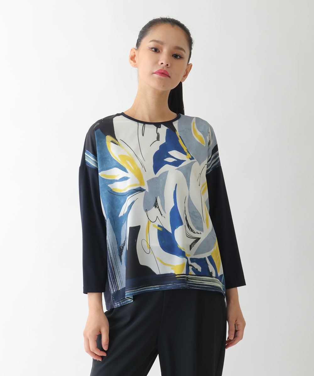 華やかなプリントのカットソーは1枚でもコーディネートが決まります。