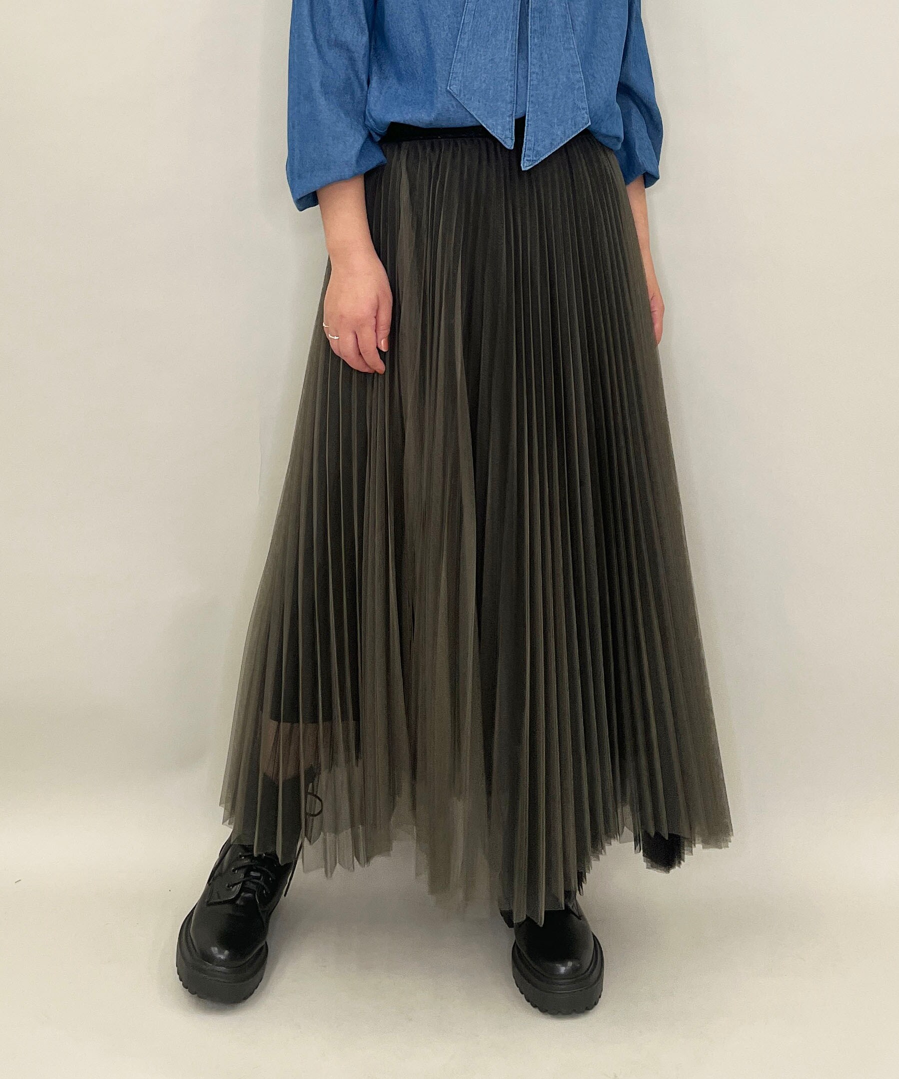 合わせるボトムスはチュールのカラーレイヤードスカート。