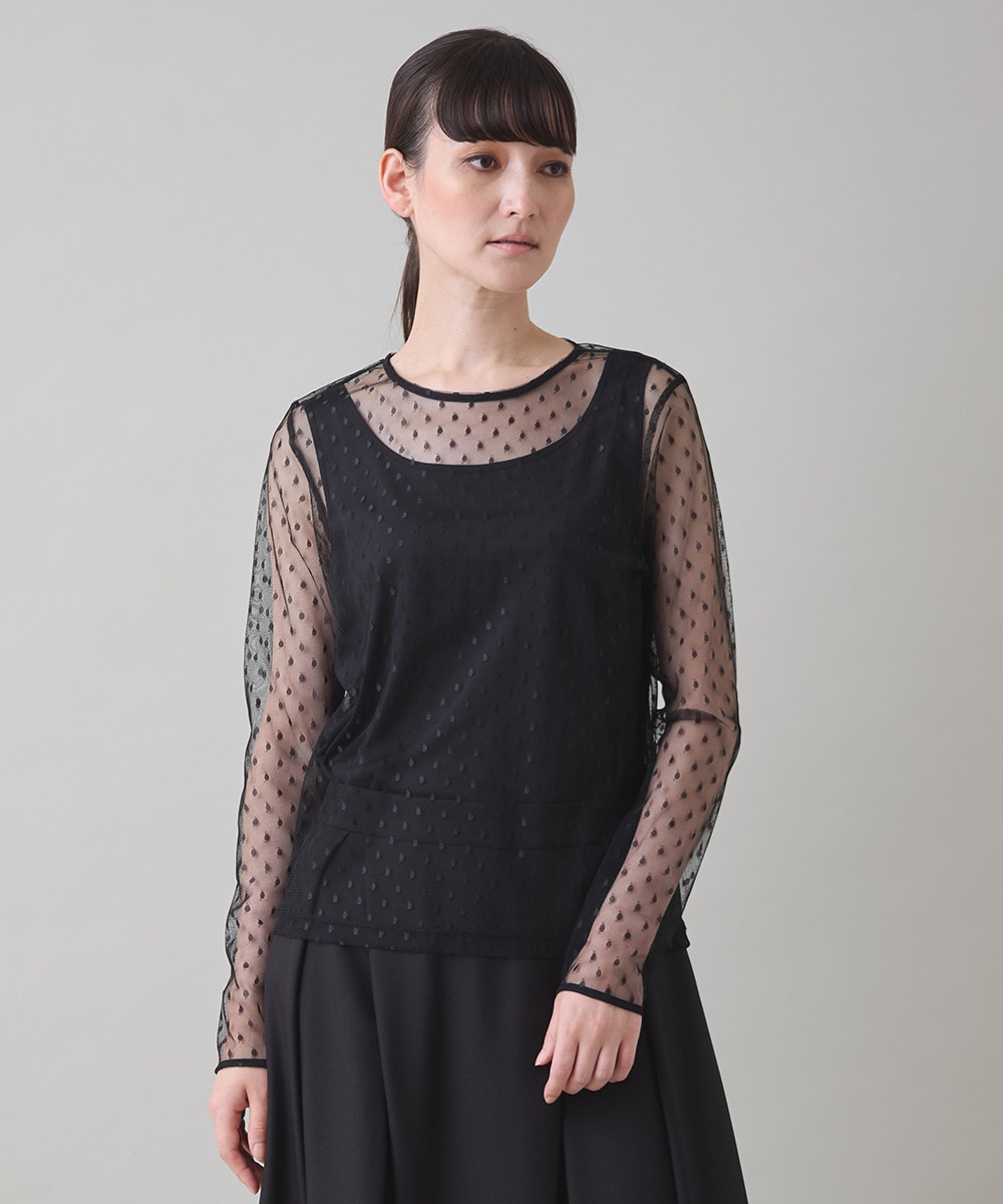 ドットチュールインナーカットソーは、日本製で洗える便利さとともに、繊細な透け感とモードなドット柄がエレガントな抜け感を演出します。