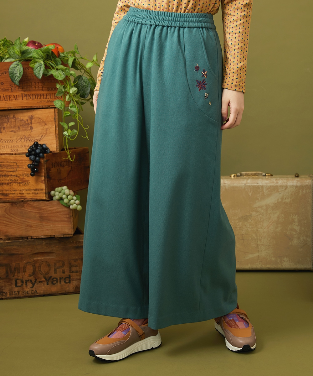 パンツはウエストゴムで中に紐もあるので調節可能です。少し太めのシルエットが全体をバランス良くしてくれます。ポケットの刺繍位置が少し下の方なのでトップスに全部隠れずにチラ見えするのかお気に入りポイントです!