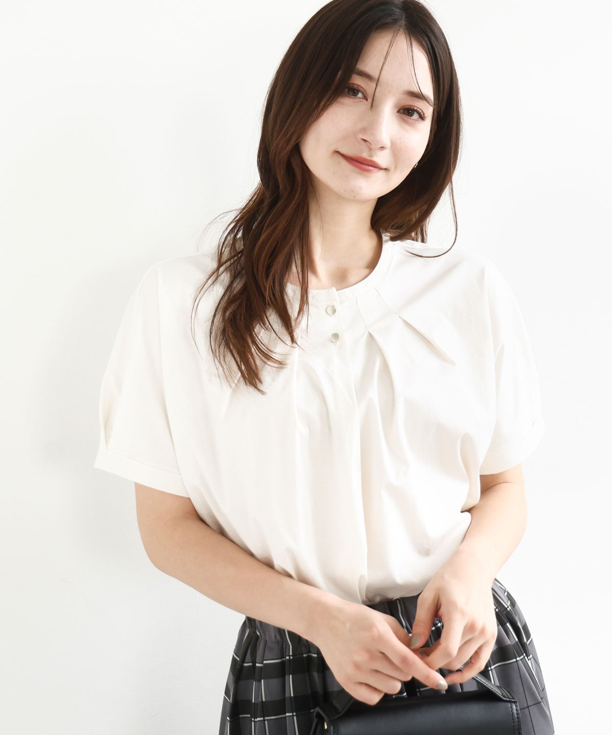 袖と衿ぐりのタックがポイントのきれいめカットソーです。