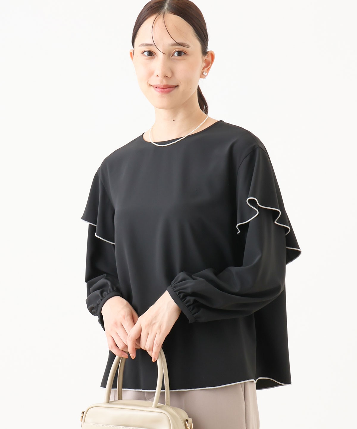 洗練された印象を演出する配色メロー フレアーデザインブラウスは、袖からバックにかけて広がる優雅なフレアがポイント。