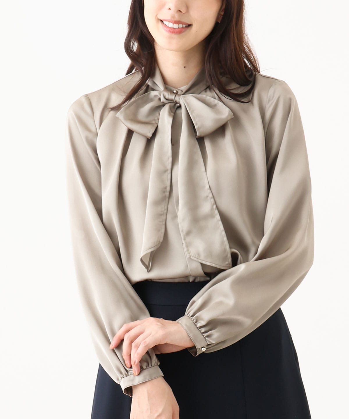 上品な印象を与えるリボン付きバンドカラーブラウスと合わせて、キレイめカジュアルなスタイルに仕上げることも可能です。