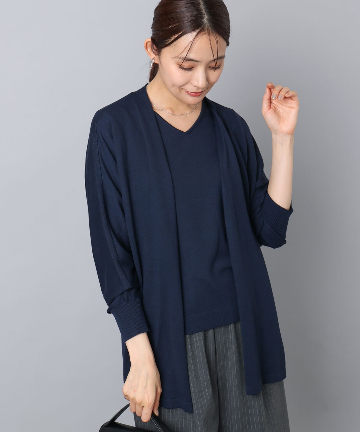 カーディガンはドルマンスリーブなので合わせるインナーの袖を選ばず◎