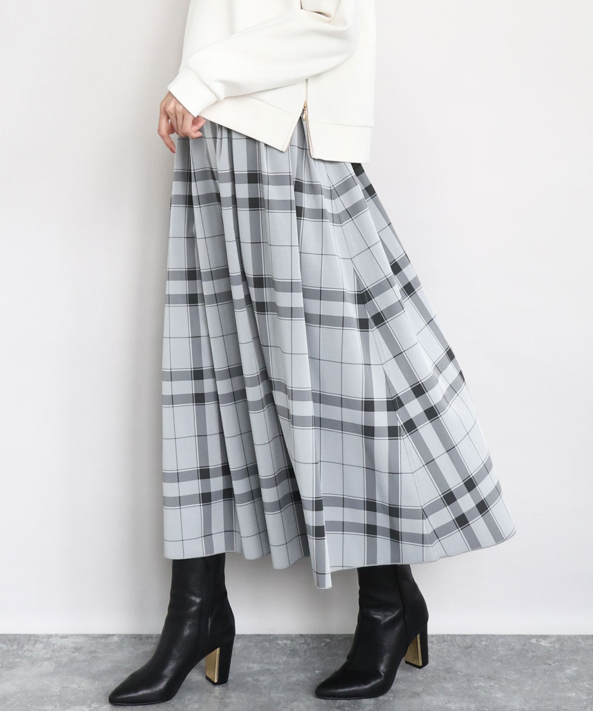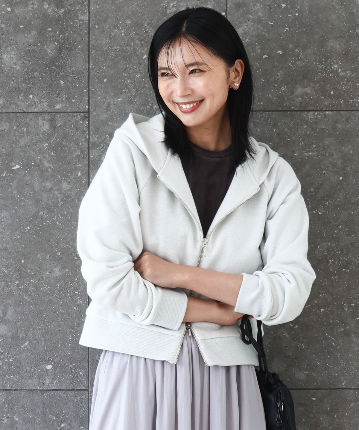 リバーシブルスカートとあわせて、大人カジュアルコーデの完成です。