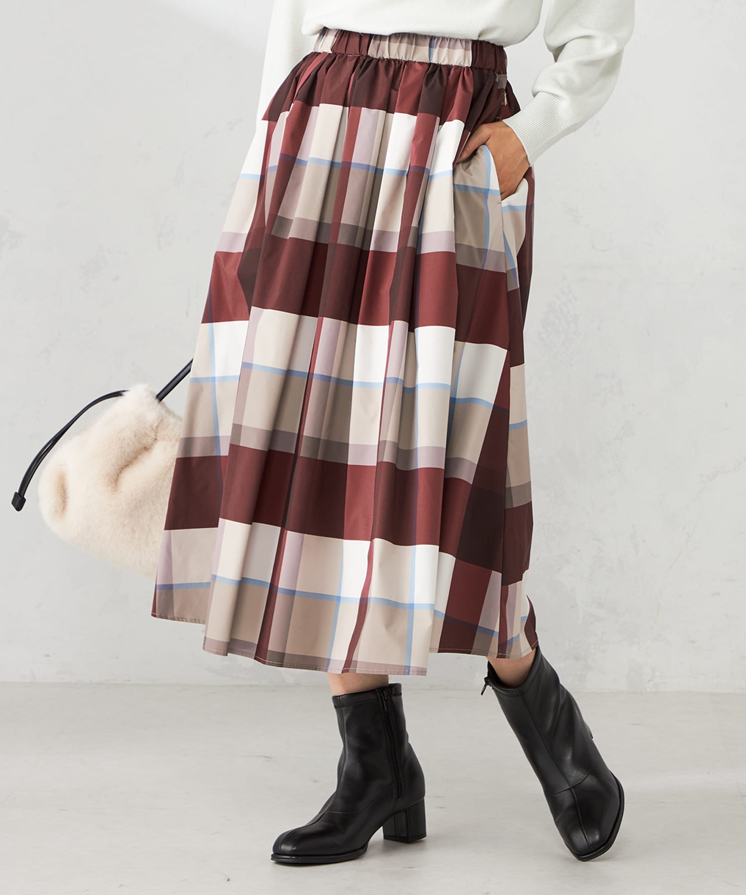 これ1枚で一気に秋コーデになるボルドーのチェック柄スカートです。ふんわりとしたシルエットで、女性らしい印象になります。アイボリーやブラックなど、落ち着いた色味のトップスと合わせるのがおすすめです。