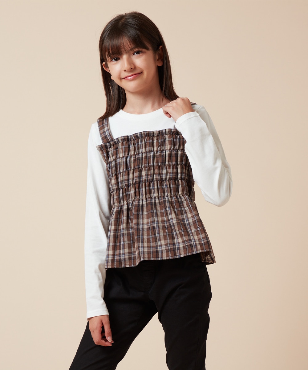 同素材チェック柄パンツと合わせると、女の子っぽいワンピースのようなコーデになります。