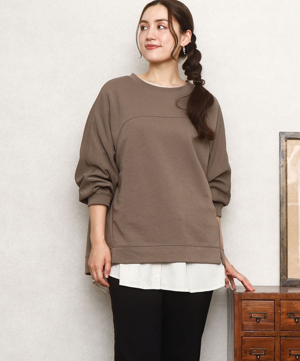 カットソーとシャツレイヤード風デザインで、気軽に着こなせるのも魅力です。