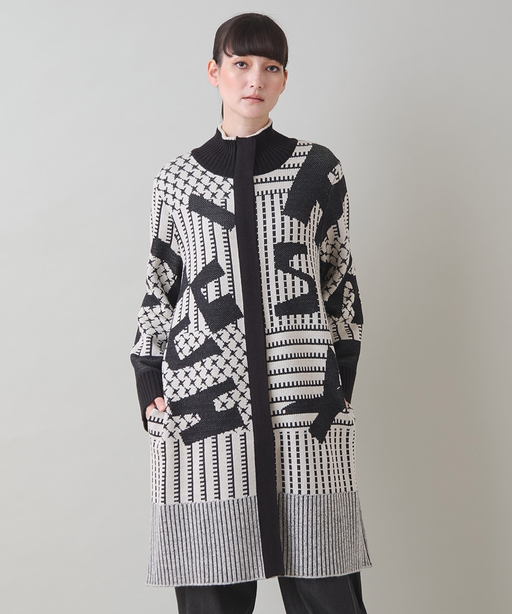 ザクっと羽織れるニットコーディガンはアイボリーベースの優しいカラーにモノトーンジャガードがシャープな甘辛ミックスのニット。ざっくり感がありながらもスッキリ見えるストレートラインで首元や手首がブラック引き締まって見えます。