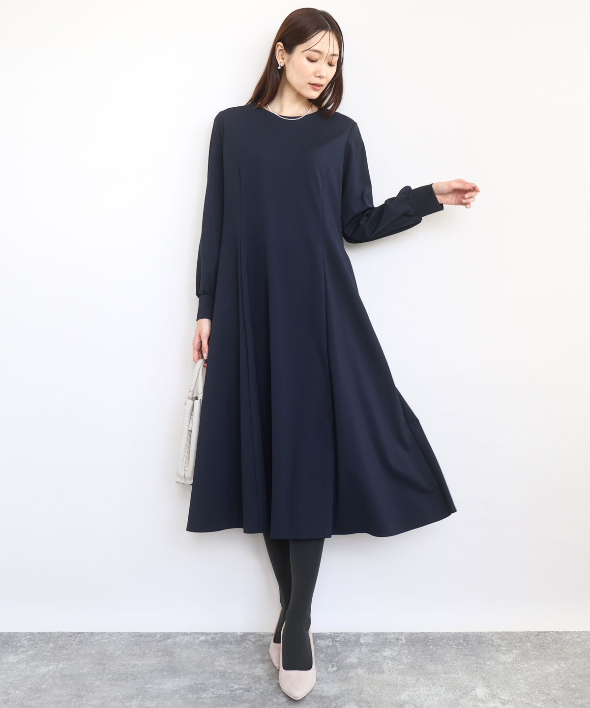 やや光沢のある素材は伸縮性があり着やすいです。しっかりとした着丈があるので高身長の方にもオススメ。やや厚手のジャージー素材なので夏以外のロングシーズン着用いただけます。きれい見えする表面感がお仕事はもちろん、お食事会などお出かけにもおすすめのワンピースです!