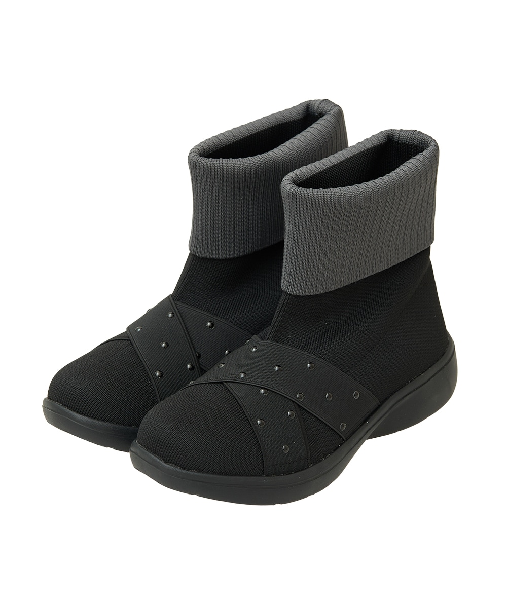 カットソーはサイドの黒の切り替えがスッキリ見えします。1枚でもさまになります。
