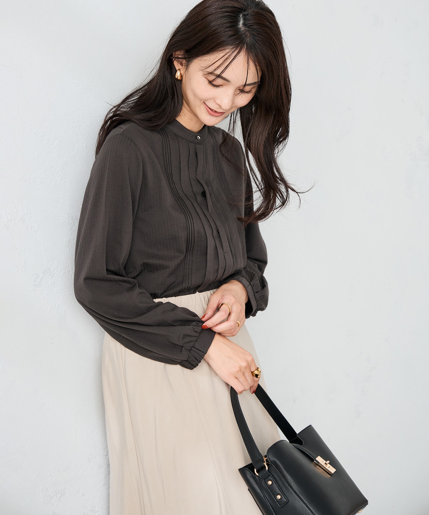 きちんと見えするピンタックトップスは細身のパンツ合わせや
