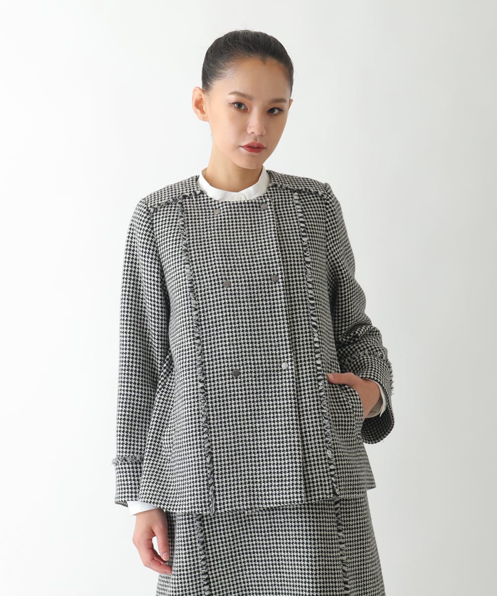 ジャケットは、トレンドの千鳥柄が洗練されたアクセントとなり、ソフトな風合いと独特な表情感が上質な印象を演出します。ダブルフロントとノーカラーのミニマルなデザインは、シンプルながらも存在感抜群。カジュアルからきちんと感まで自在に調整できるため、シーンに応じてスタイルを格上げ。大人の着こなしを叶えるアイテムです。