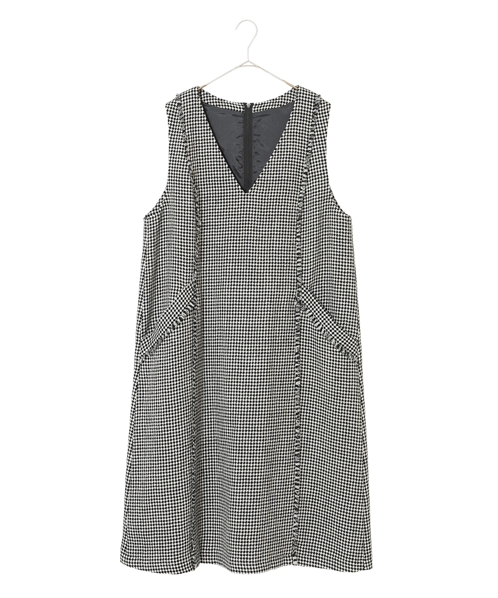 上品な千鳥チェックツイードジャンパースカートは、深めのVネックとすっきりとしたAラインシルエットが大人の魅力を引き立てます。