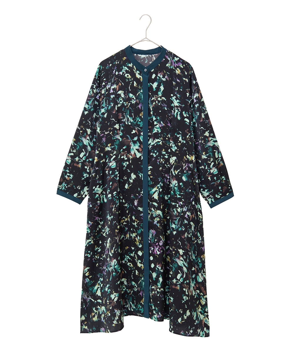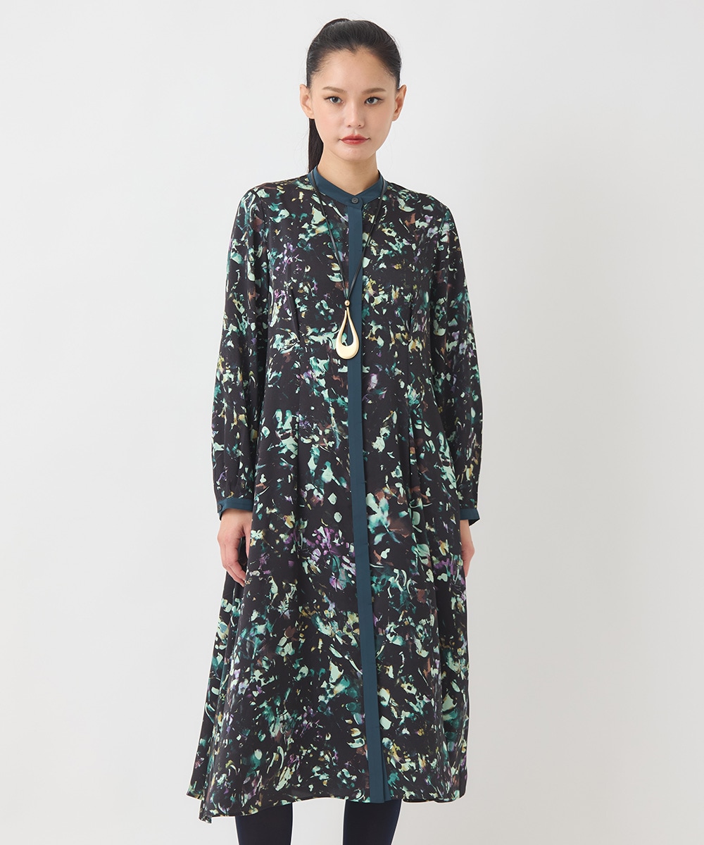 リーフプリントバンドカラーワンピース。秋らしいカラーのアーティスティックなプリント柄が印象的。ウエストに施されたタックでスタイル効果アップも。柔らかな肌触りで着心地◎