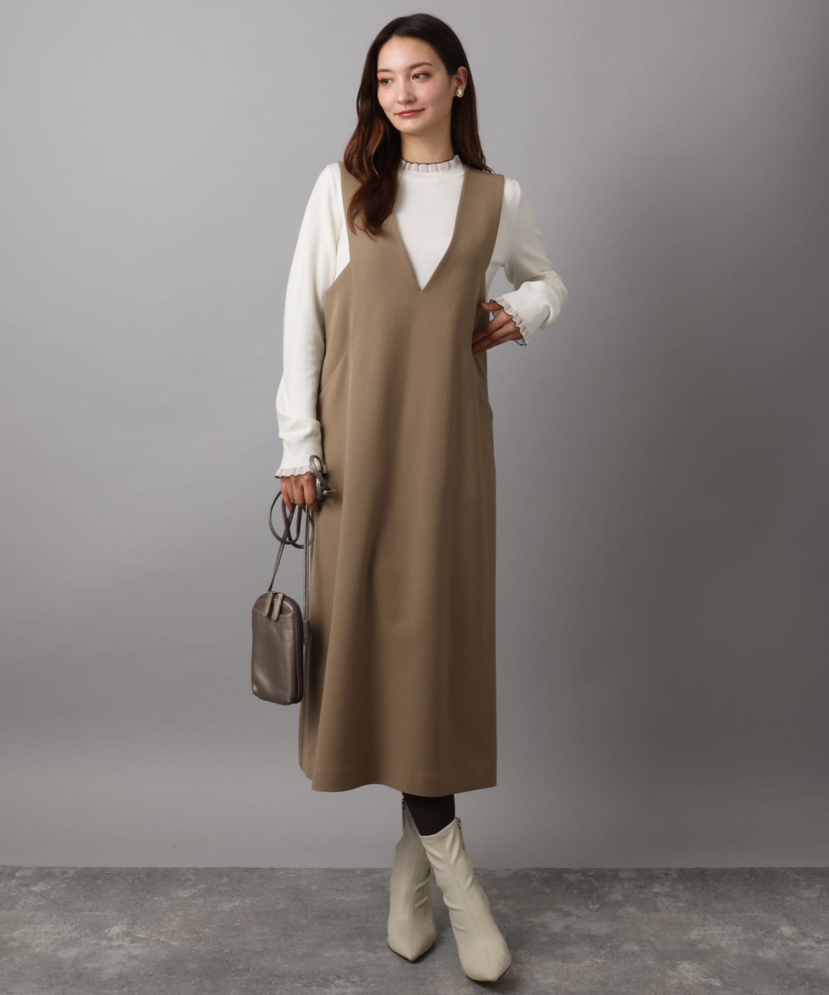 深めのVネックのジャンスカは環境に優しい機能素材を使用。
