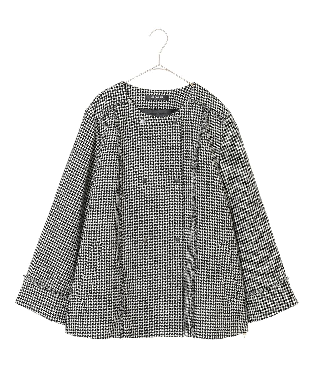 [大人のクラシックコーデ] お洒落見え! 千鳥チェックツイードジャケット✖️ジャンパースカートのスタイリングのご紹介です。 ◆ 千鳥チェックツイードジャケット ノーカラーにダブルフロントのミニマルな フォルムと幅のあるお袖がポイントのジャケット。 柔らかで着心地良く、裏地付きで着崩れしに くいです。 肩から見頃サイド、袖に小さめなフリンジで 華やかさUP! フォーマルにもカジュアルにも対応できるのが魅力。 ◆ ピンタックコンシャスブラウス きりっとさせたスタンドカラーにピッチを変えたピンタックラインがアクセントのブラウス。お袖もふんわりと立体感のあるデザインで一枚着でサマになります。 着丈も長すぎないのでインしなくても バランスが良いです。 ◆ 千鳥チェックツイードジャンパースカート 深めのVネックに広がりすぎないすっきりとしたAラインのジャンパースカート 。 斜めに入ったポケットやサイドラインに加えたフリンジアクセントがお洒落なポイント! インナー次第で雰囲気が変わるので キレイめからカジュアルまで幅広く着回しできます。 シューズ:スタッフ私物 ◆着用した商品の詳細は下記添付してます。 ぜひ、ご覧ください ↓