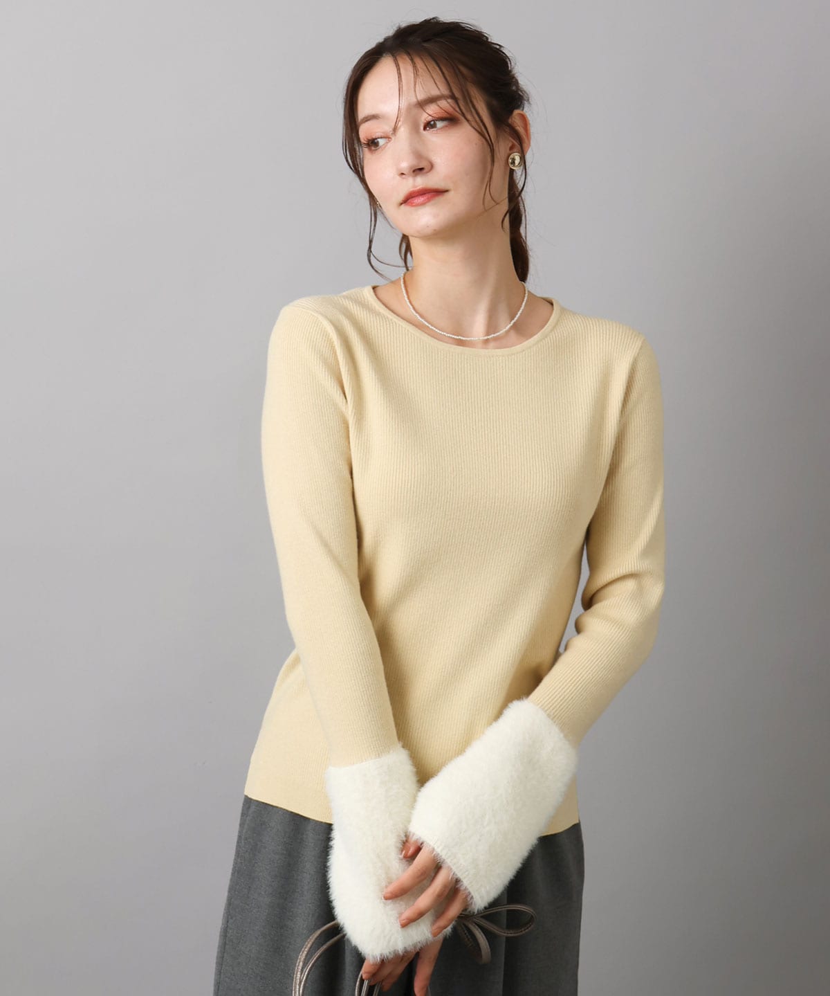 柔らかい素材のイエローのニットはシンプルながらお袖口のふわふわ軽いファーがポイント
