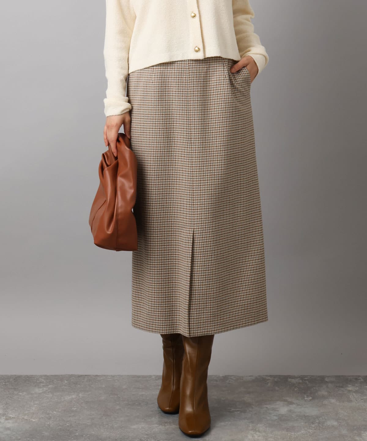 細かな柄のナロースカートと合わせるとスッキリとした印象で可愛い中にも落ち着いた上品な雰囲気のコーデです
