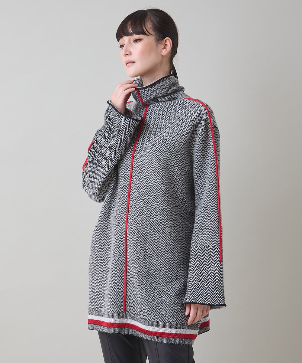 とても柔らかく着心地の良いヘリンボーンハイネックニットは、配色ラインがアクセントとなり、クラシカルな柄ながら新鮮さを演出します。