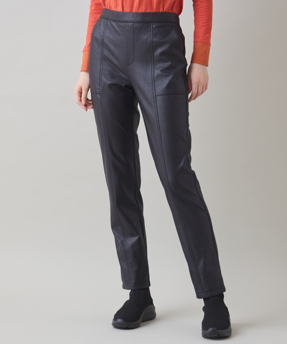 レザーライクスリムパンツは、光沢感とストレッチ性に優れ、体型をすっきり見せながら高級感をキープ。