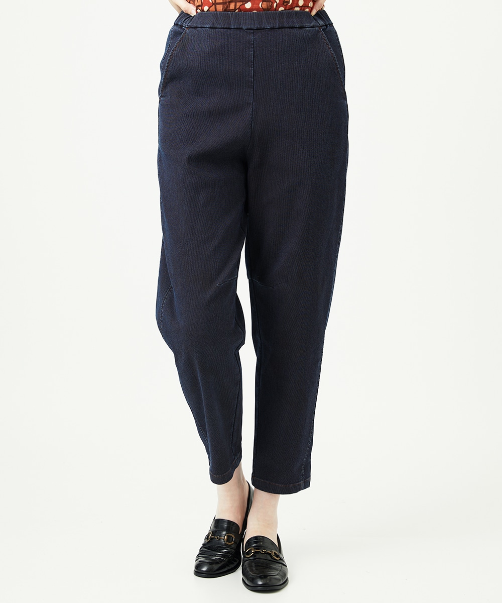洗えるデニムカラーリバーパンツは、バイカラーの裏地とゆったりシルエットで、大人かわいいスタイルを完成させます。
