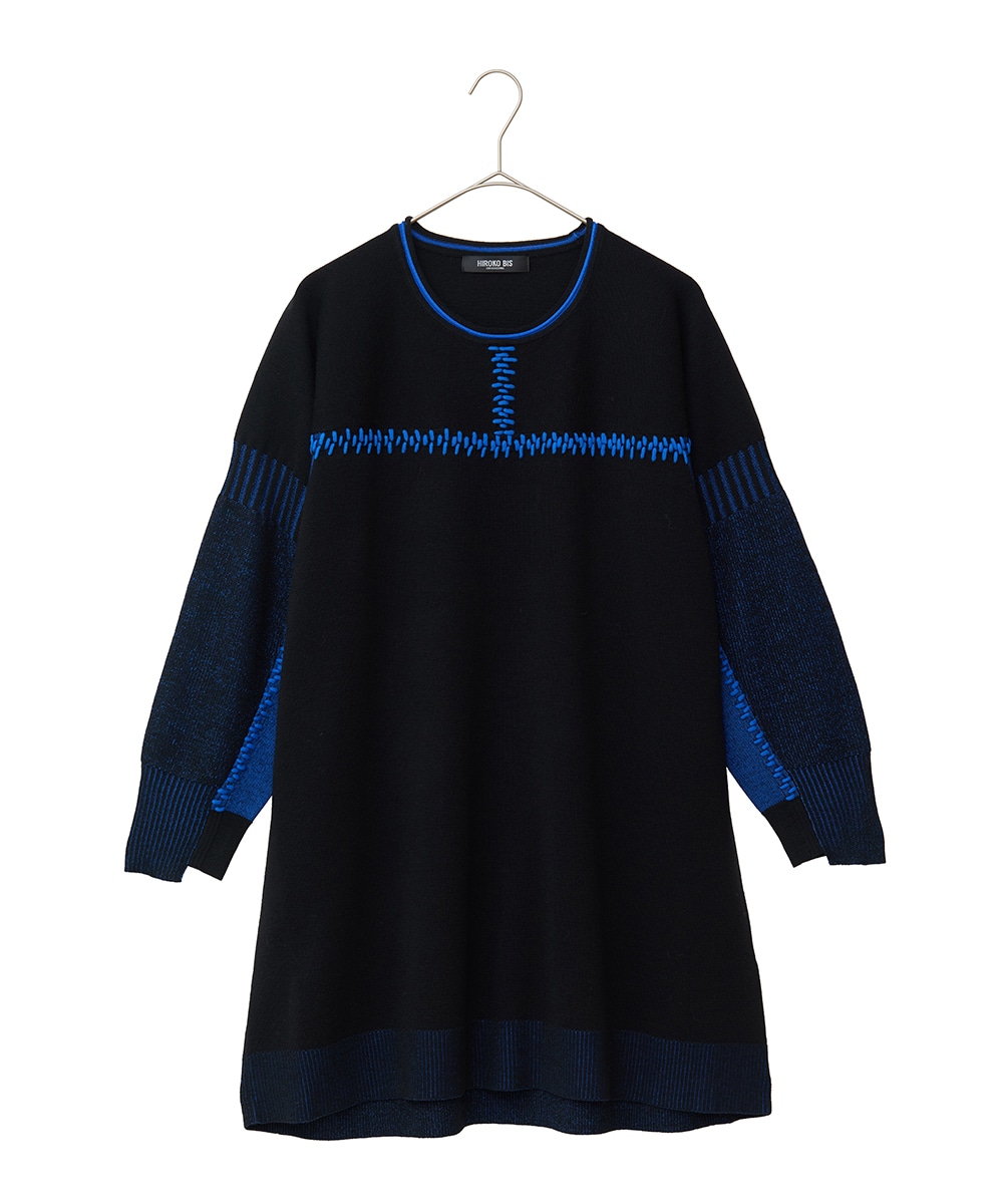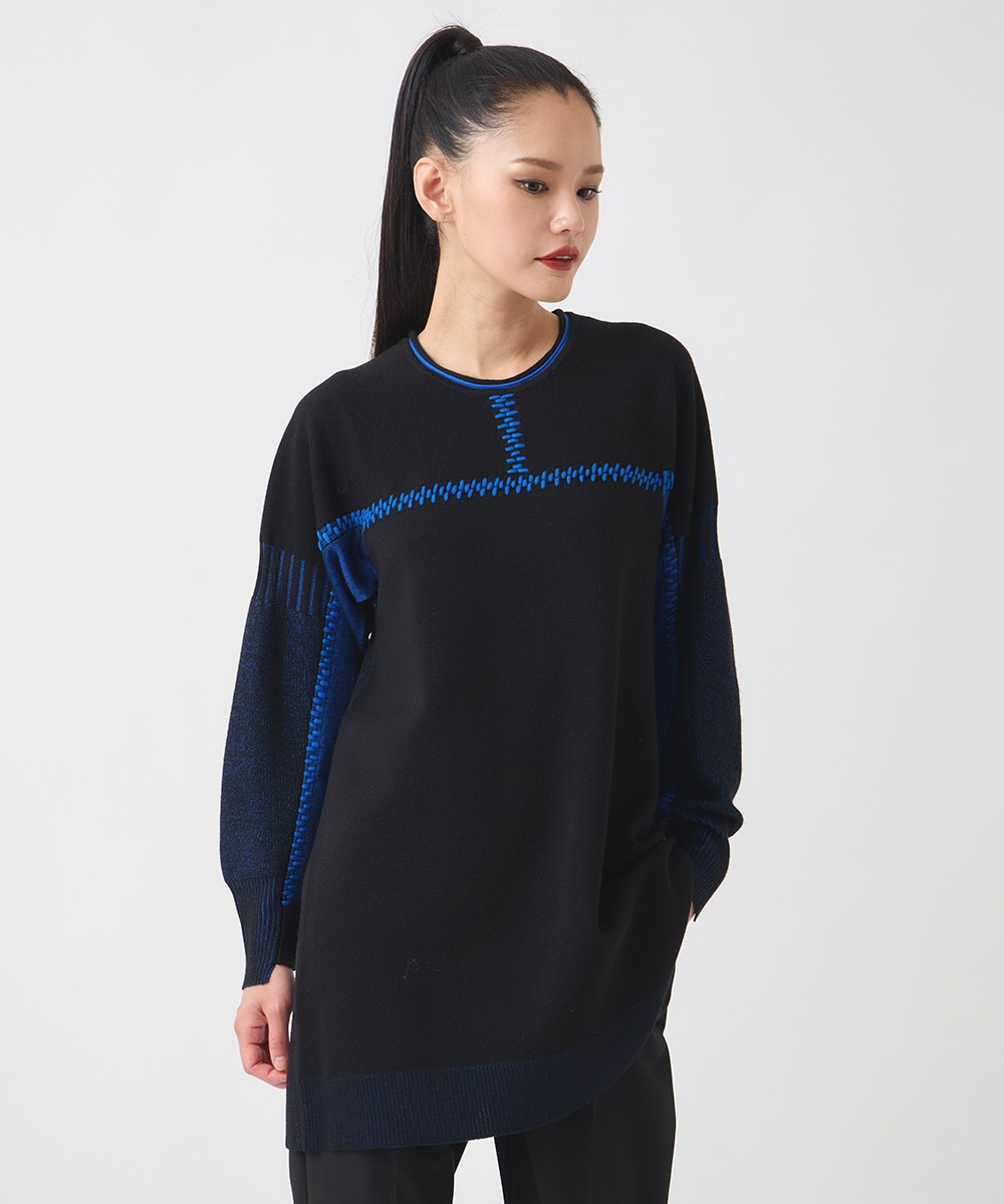 プレーティング刺繍ニットチュニックは、立体的なハンドステッチが目を引き、ソフトなカラーコントラストを生み出すプレーティング技法で、シンプルながらも存在感のあるデザインです。
