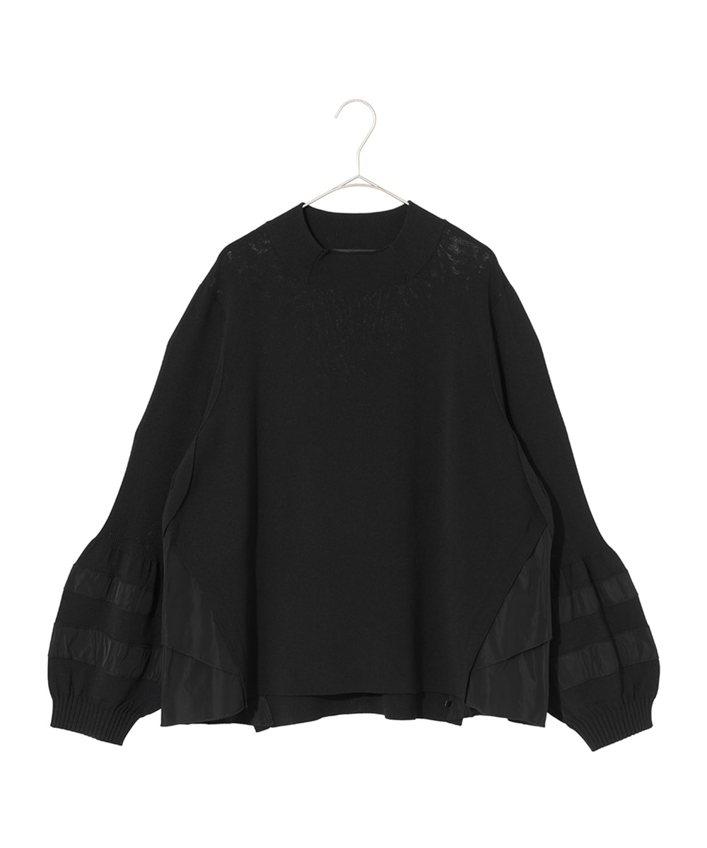異素材ジョイントニットプルオーバー。光沢のあるタフタ素材とニットのコントラストが魅力的。丸みを持たせた特徴的な袖口やサイドのタックディテールがポイント。肌触りも良く着心地◎