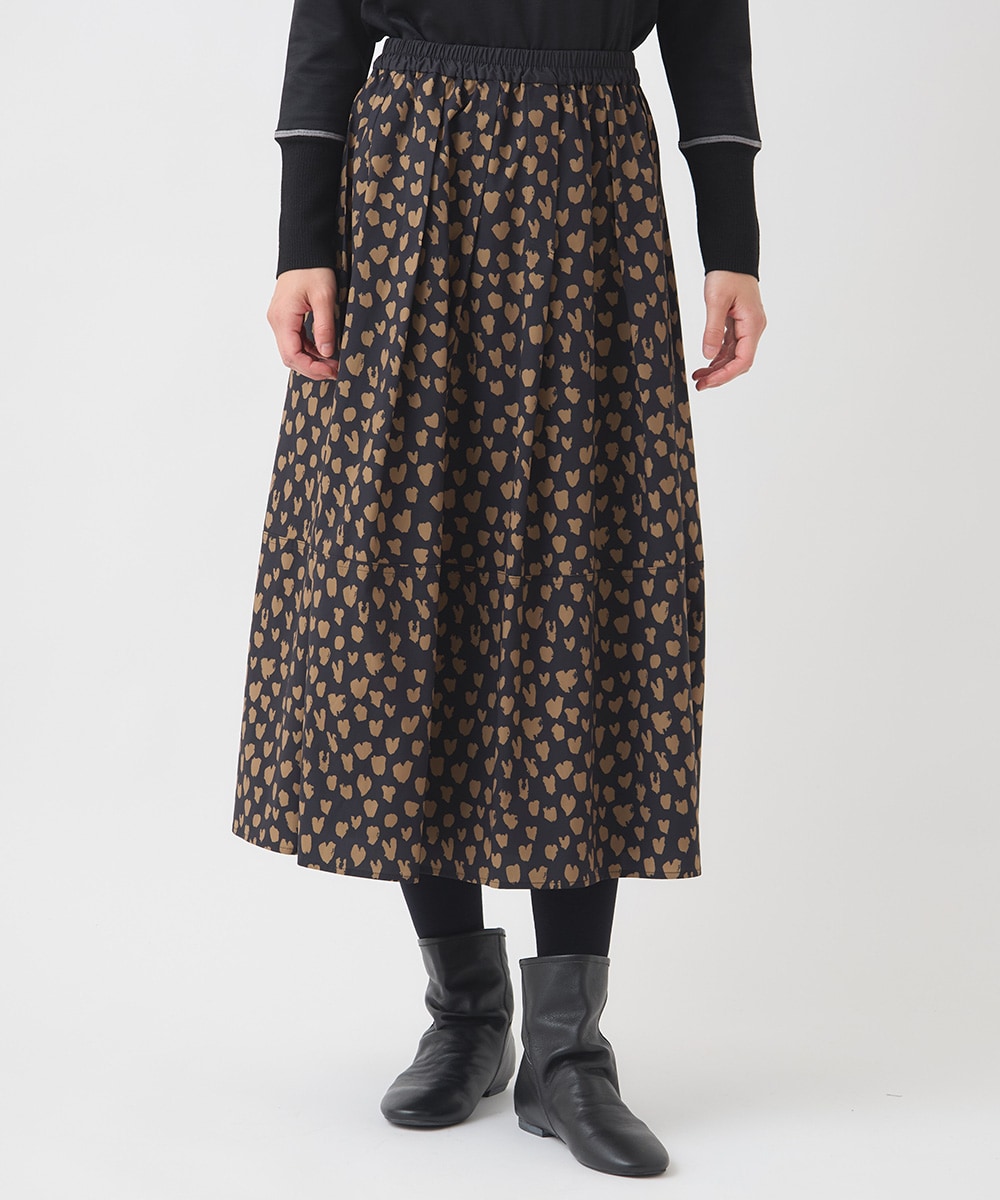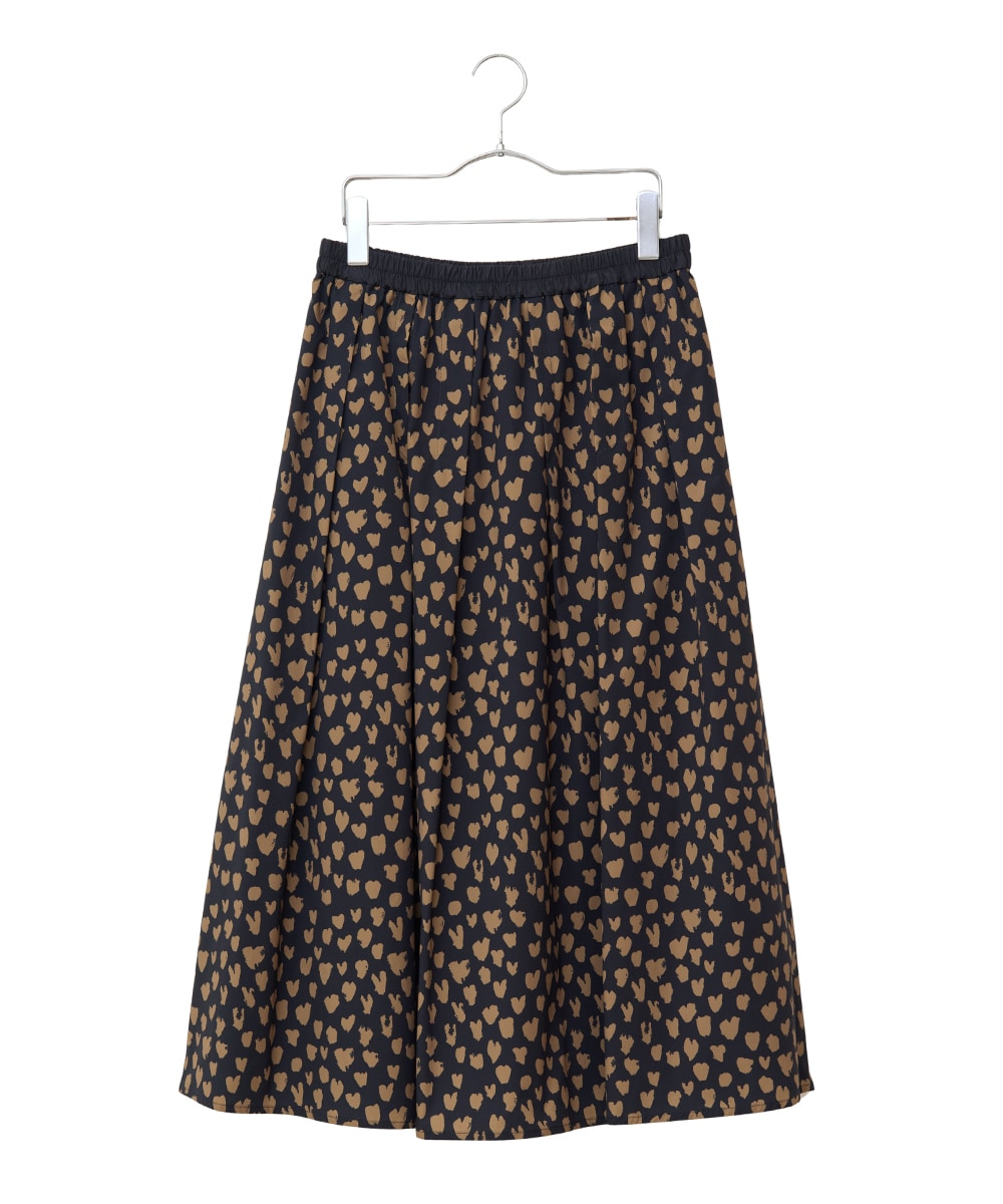 ドットプリントフレアスカート。ハート柄のドットが大人フェミニンな印象です。ウエストゴムでラクな穿き心地です。