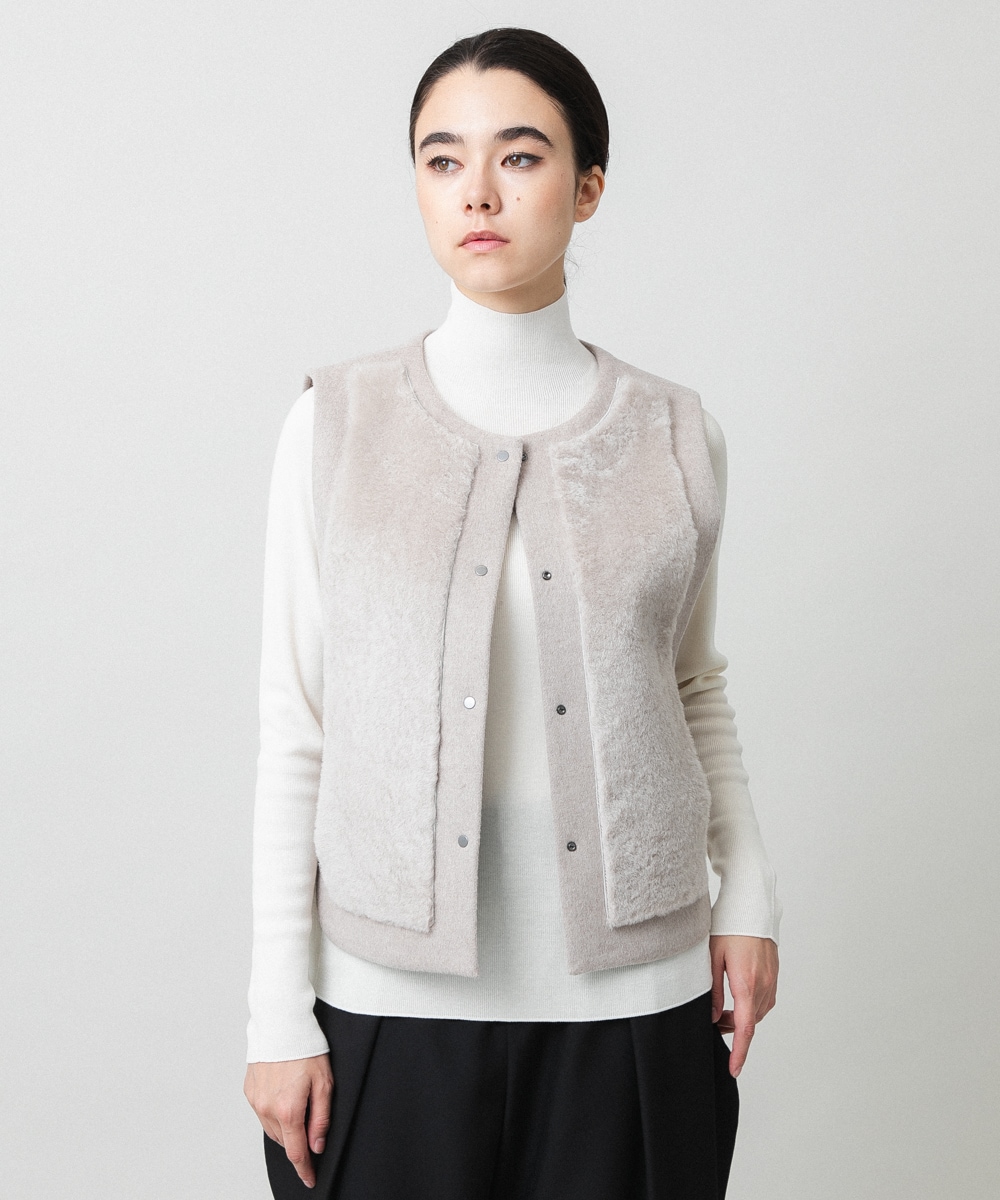 秋冬の必須アイテムのファーベスト。リアルムートンとカシミア混のリバーコート素材の高級感ある一枚です。コンパクトな着丈、後身頃はすっきりとしたシルエットです。絶妙なカラーでどんな色とも好相性のためさっと羽織ることができます。ニットと重ねたレイヤードスタイルの他に冬はコートインでも楽しめ、ロングシーズンで活躍します。
