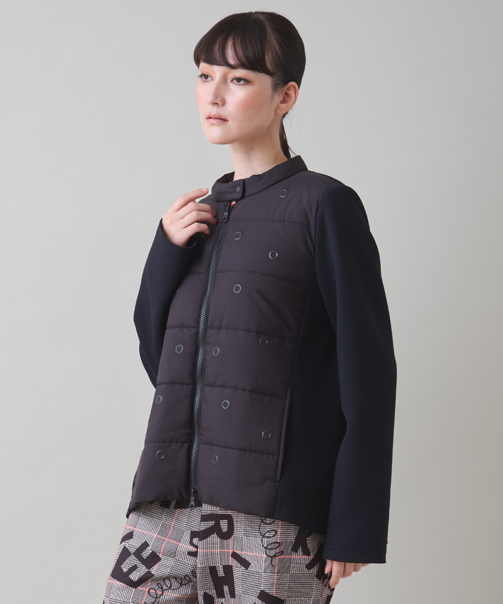 前身頃はタフタ素材にリングを散りばめたモードなお作りです