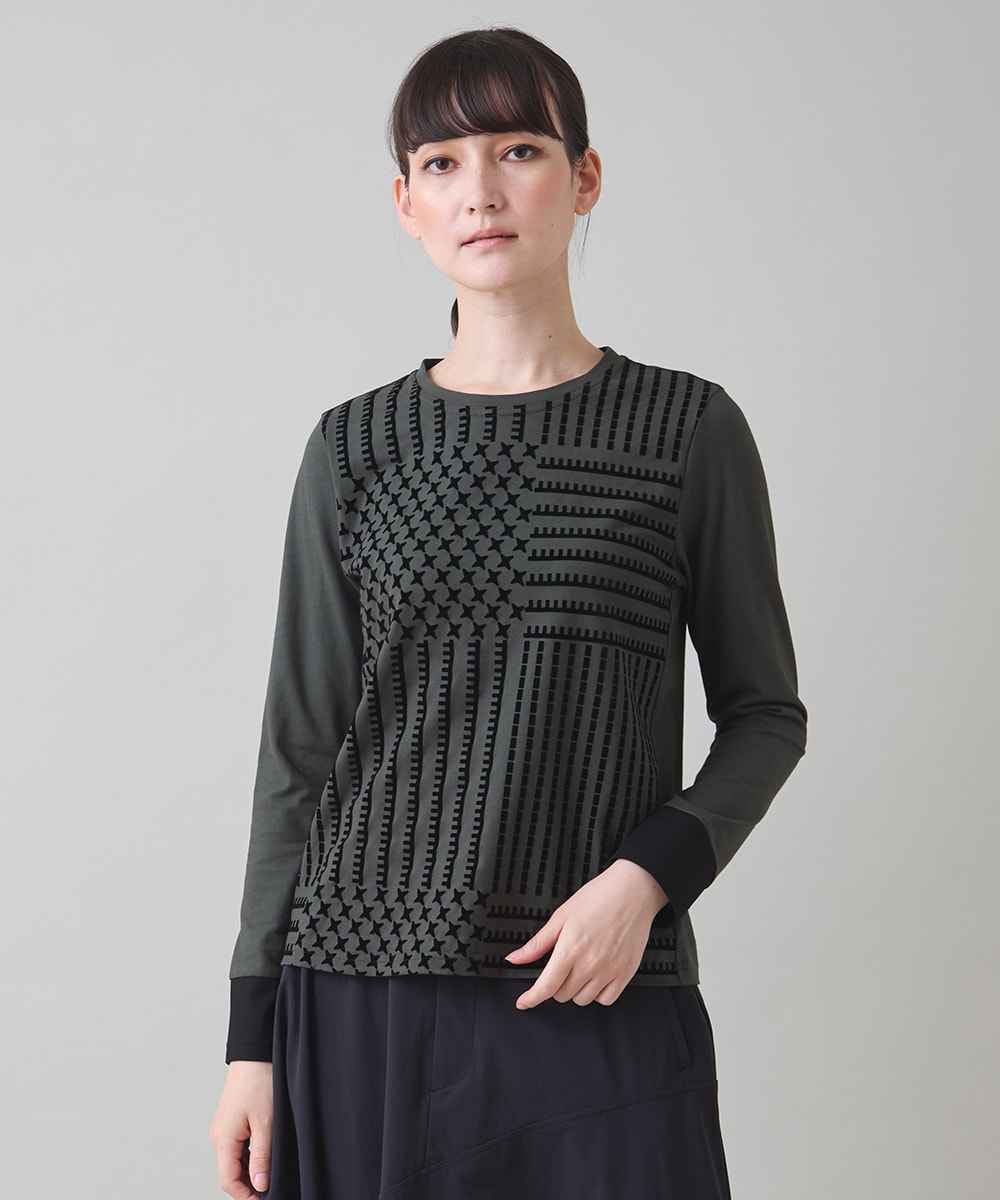 肌触りの良い綿素材に個性的な柄を、フロッキープリントしたカットソーも、ボトムを選ばず合わせていただきやすいのでおすすめです。