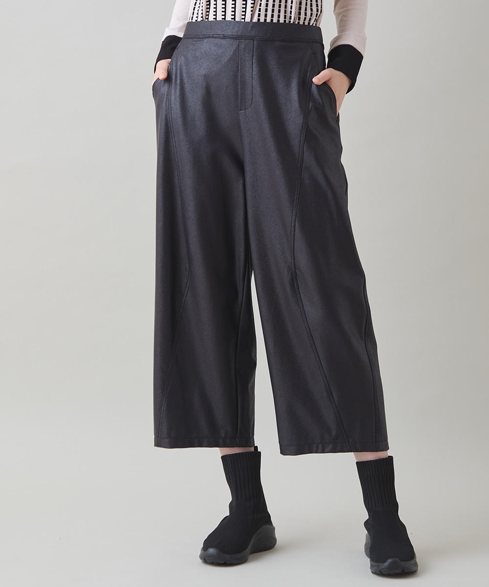 一方、ストレッチレザーのウエストゴムコクーンパンツは、肌触りの良い綿素材と上品な光沢感が特徴。