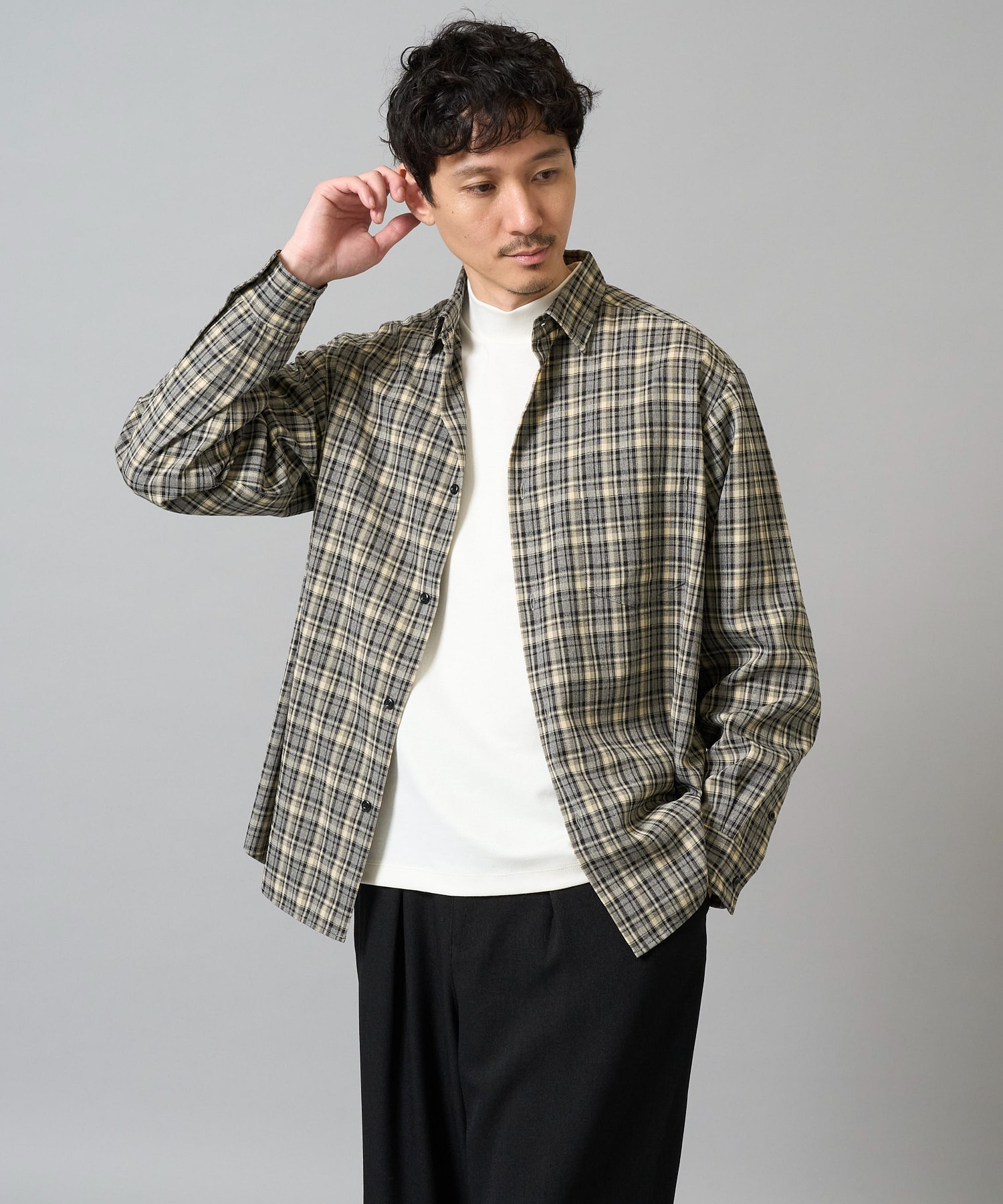 チェックシャツはサラッとした肌触りで、
