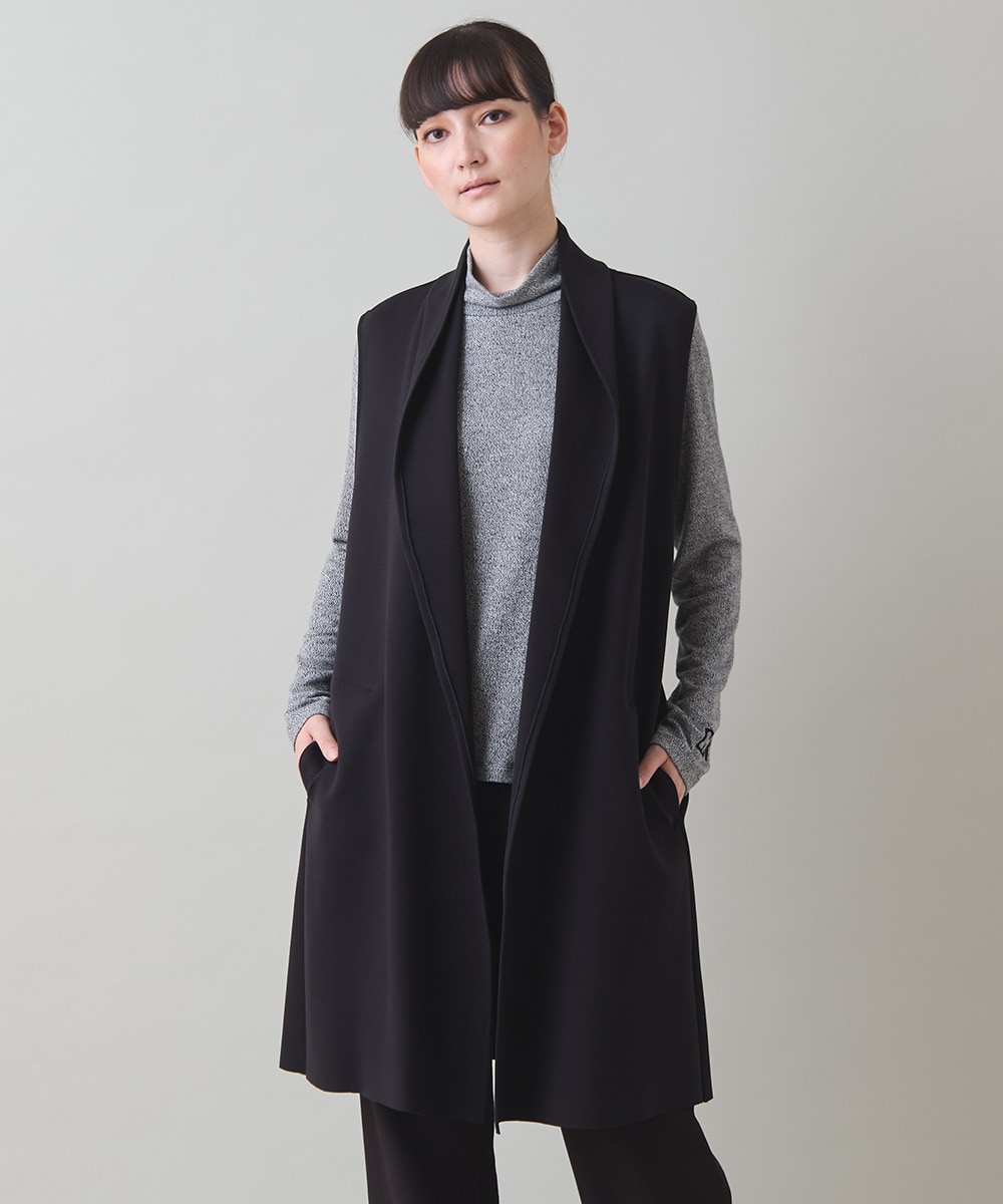 優しい襟がカーブしたポンチ素材のロングジレを重ねました。重ねるだけでオシャレ度アップ、これから長い期間お使い頂けるアイテムです。