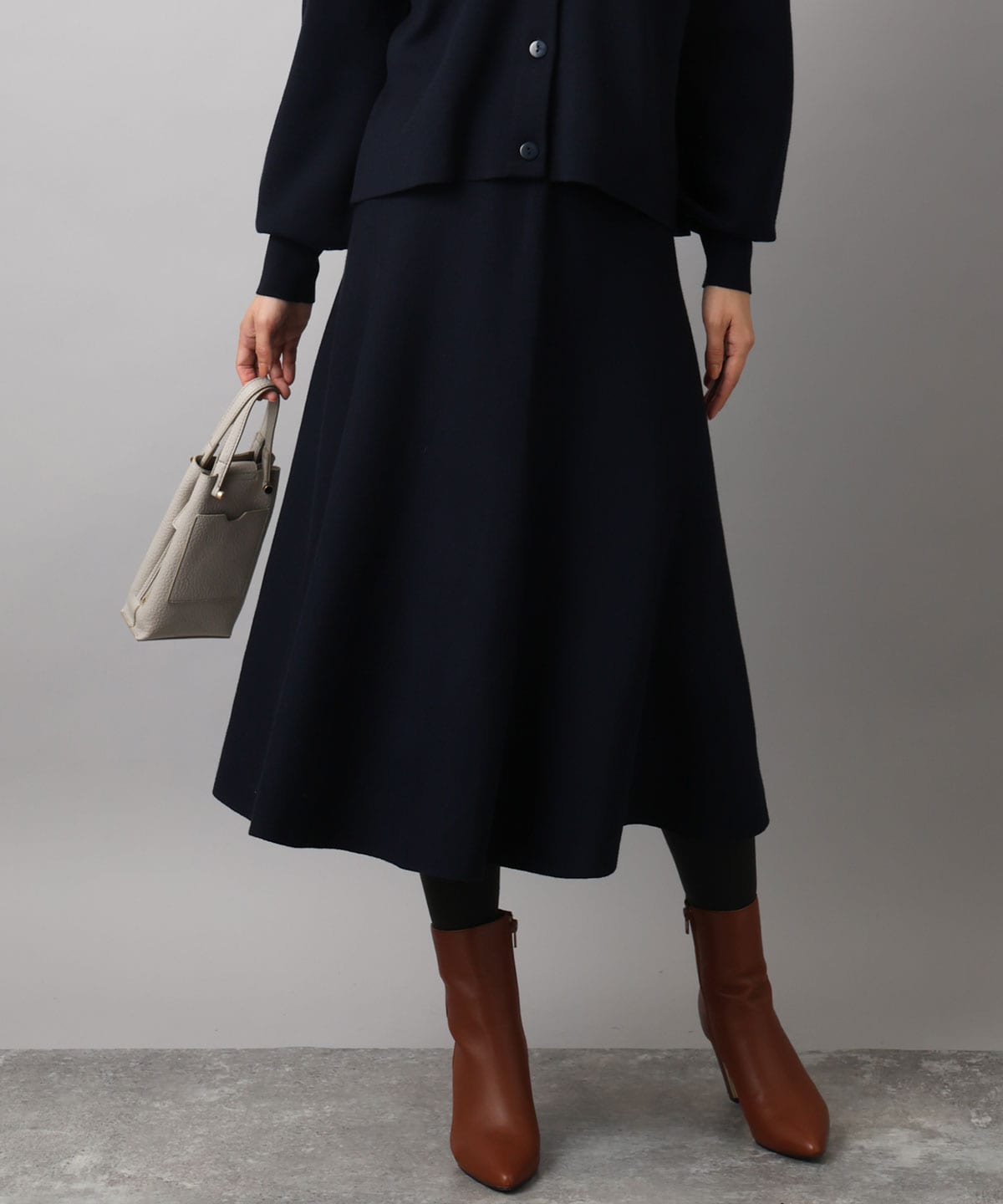 落ち感のあるフレアーシルエットが素敵な、この季節に映えるきれいめニットスカートです。厚手すぎないほどよくしっかりとした肉感で型崩れしにくく、裏地付きで透け感なし&足さばきも良いのがうれしいポイント。表面は起毛感のないなめらかな手触りでカジュアルすぎず、オンオフ兼用で着回せそうです。ウエストは総ゴム仕様で窮屈感なくらくちん。長すぎない丈感なので、ブーツやタイツとのカラーコーディネートも楽しめるおすすめのアイテムです。