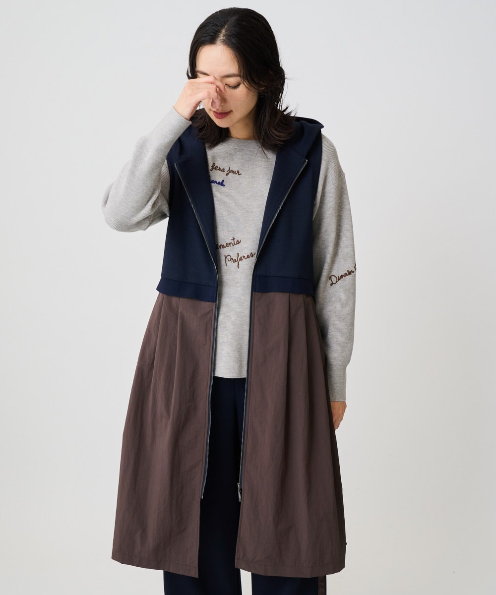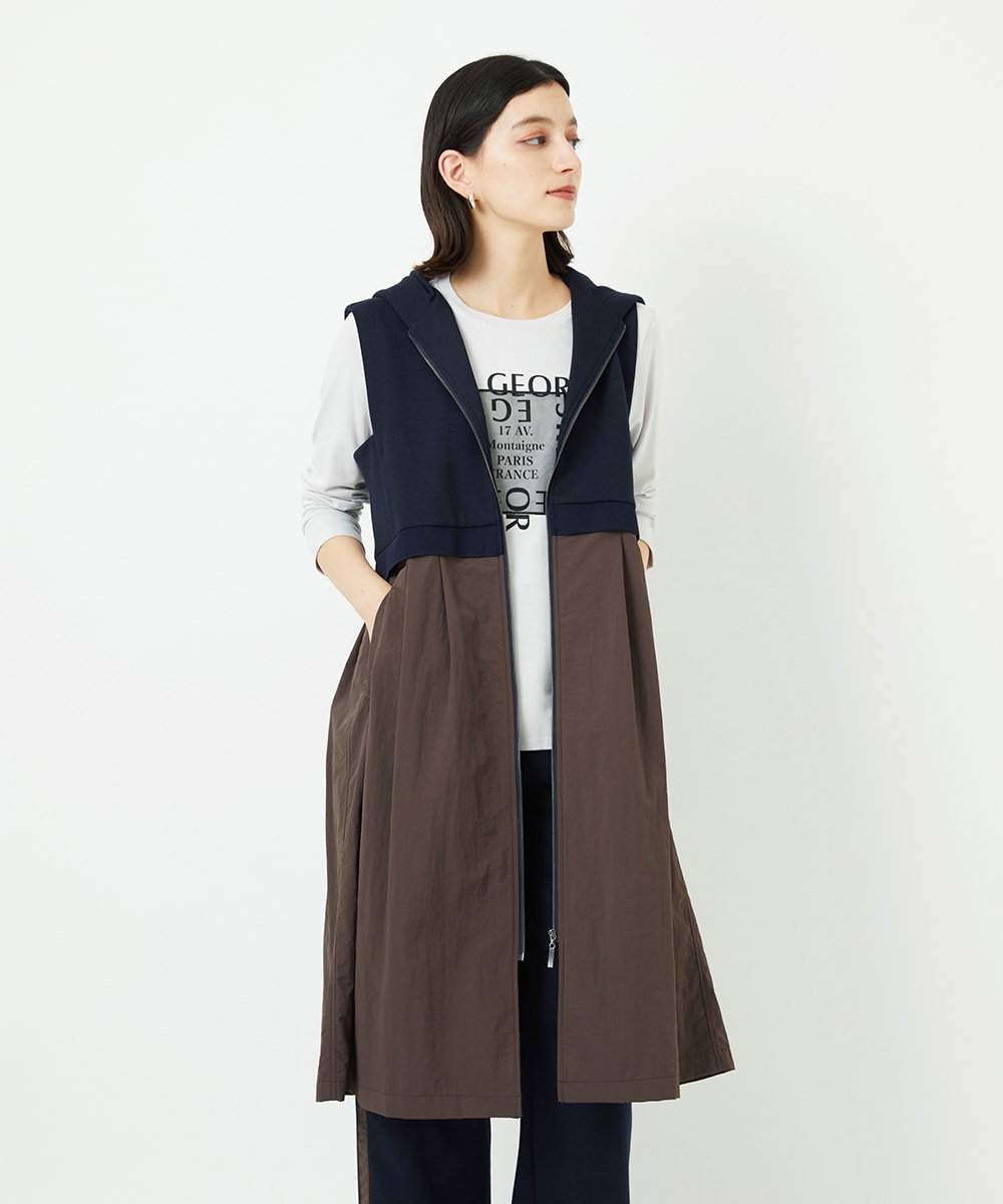 ダンボールとタフタの異素材ミックスのロングジレは、フード付きで軽やかに羽織れるため、秋冬のコーデにアクセントを加えます。