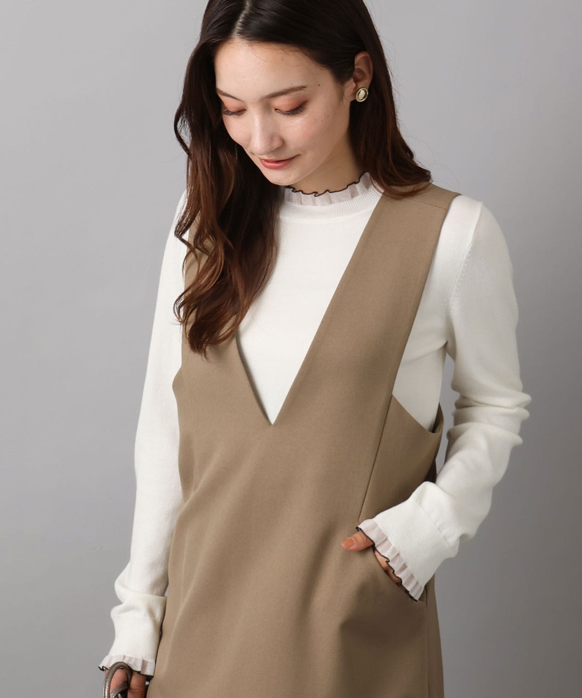 【ミニブークレーカーディガン/洗える】 ジャケット風デザインのコンパクトカーディガンは大人かわいい素材感がポイントです。 程良い表面感のあるミニブークレーの素材で 秋から春のはじめまで長く着用が可能。 ワンピースやスカート、ワイドパンツとバランス良く着られる着丈です♪ 釦を閉めてトップスとしても着用可能です。 【ウールライクVネックジャンパースカート/洗える】 旬なジャンスカはウール見え素材で秋冬モードにアップデート。 インナーを選ばず着られるVネックと 長すぎない着丈が重くならずに着られるシルエットが魅力です◎ ウールのような風合いが特徴のポリエステル素材は暖かさと軽やかさが特徴です。 気温に左右されずに着られるジャンパースカートは秋から春にかけて活躍してくれます。