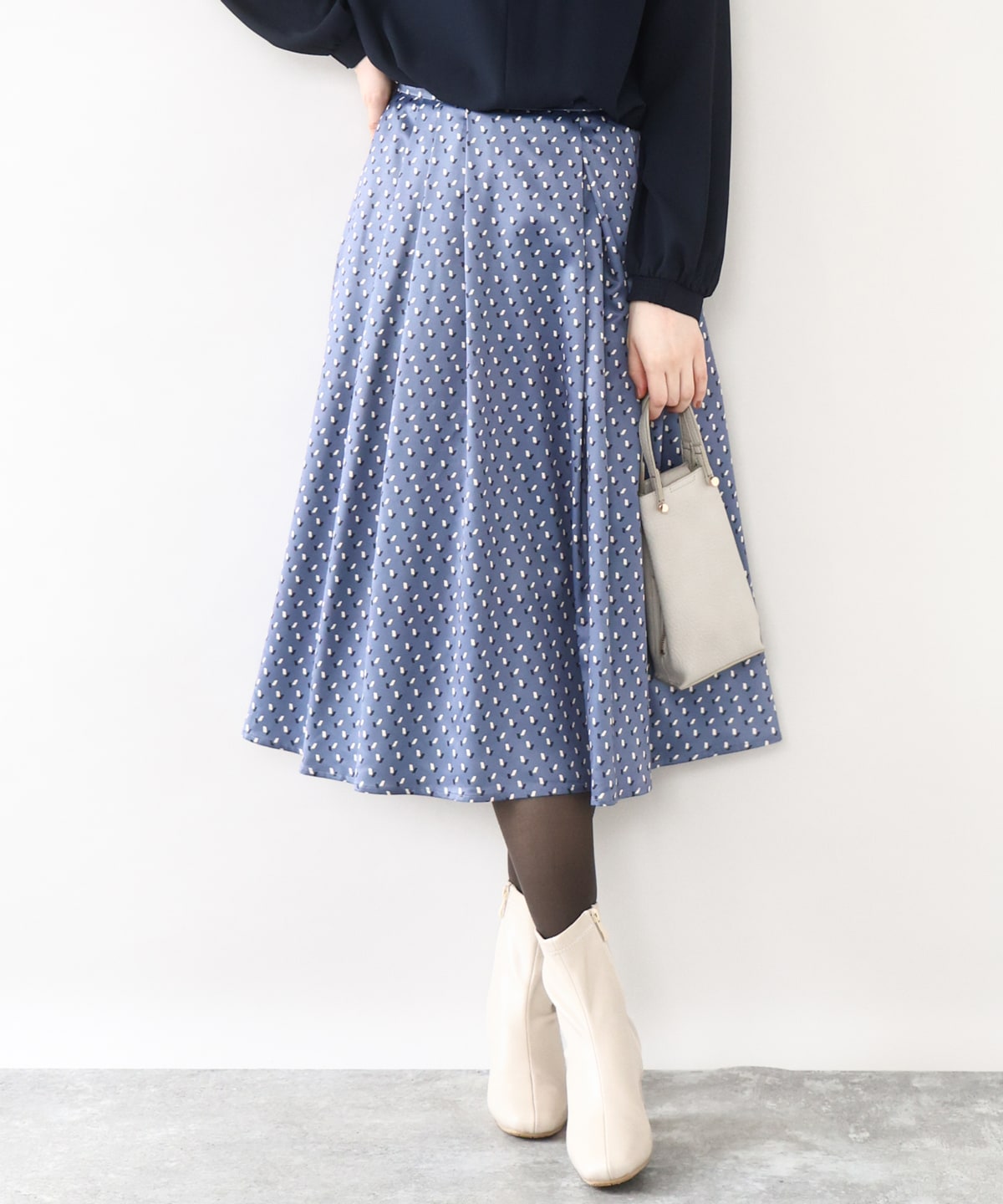 合わせやすい幾何柄のスカートはアシンメトリーのタックとフレアシルエットで、大人の女性の魅力を引き立てるデザイン。