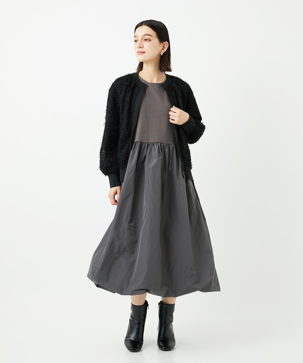 一枚あるととっても便利なジャンニロのドッキングバルーンワンピースとシンプルなデザインがコーディネートしやすいドット釦コンパクトニットカーディガンです。 ワンピースは異素材がドッキングしたデザイン。 身頃部分はカットソー素材で伸縮性があり動きやすい! スカート部分はハリ感がありボリュームのあるデザインです。 羽織るアイテムによって見え方も印象も変わります。 ニットカーディガンは前立てに並んだドット釦がポイント。 カジュアルになり過ぎない羽織りです。 着丈が短めでスッキリ見えするのが嬉しい♪ インナーを選ばず、カジュアルコーデからキレイめコーデまで着回せる一枚。 ※着用サイズ: 36(S) ※手洗いOK