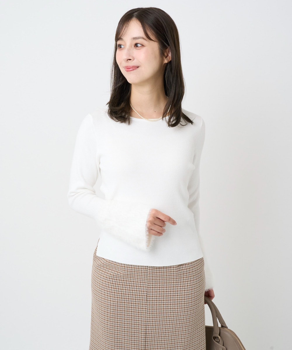 袖口のフェザー素材がポイントとなり、きれいめな印象を演出します。