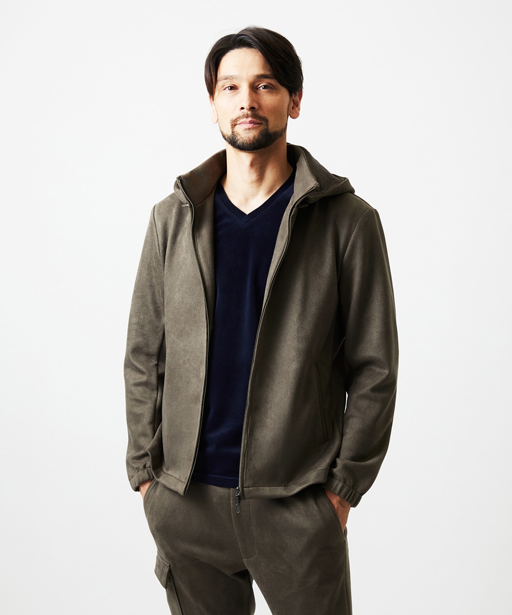 『カーキーブルゾン』 スウェード調のポリエステル素材で 伸縮性に優れているのでストレスフリー フードも取り外せて使い勝手よく デニムと合わせてカジュアルに