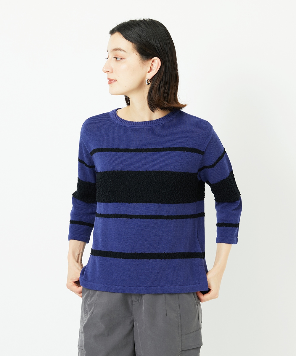 もこもこの凹凸感のあるボーダーニットで8部袖がお洒落です。