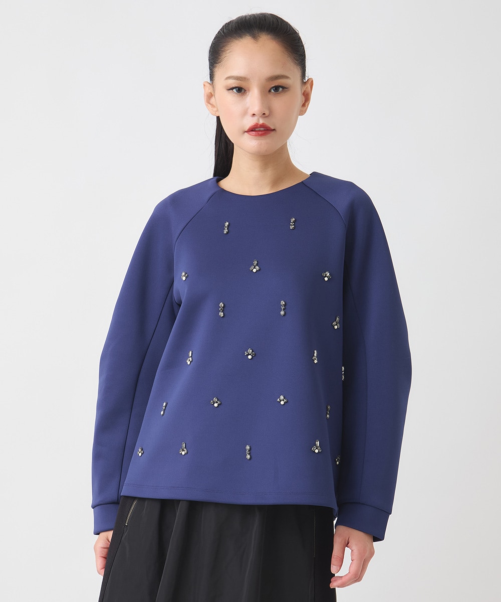 カットソーは、ダンボール素材で軽くて保温性もあり、コートのインナーとしても大活躍です。ビジュー刺繍が華やかでカジュアルになり過ぎず、スカート、パンツ、どちらにも相性ピッタリです。