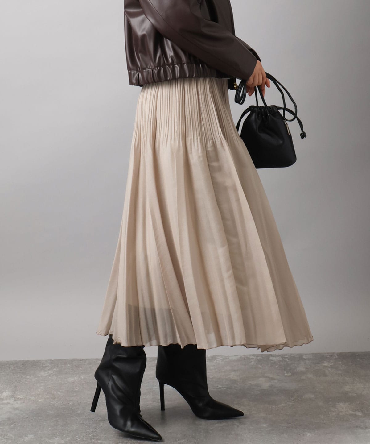 シアープリーツスカートは、光沢と透け感が大人の上品さを引き立て、細かなプリーツと裾まで消えるようなデザインが美しい凹凸を生み出します。