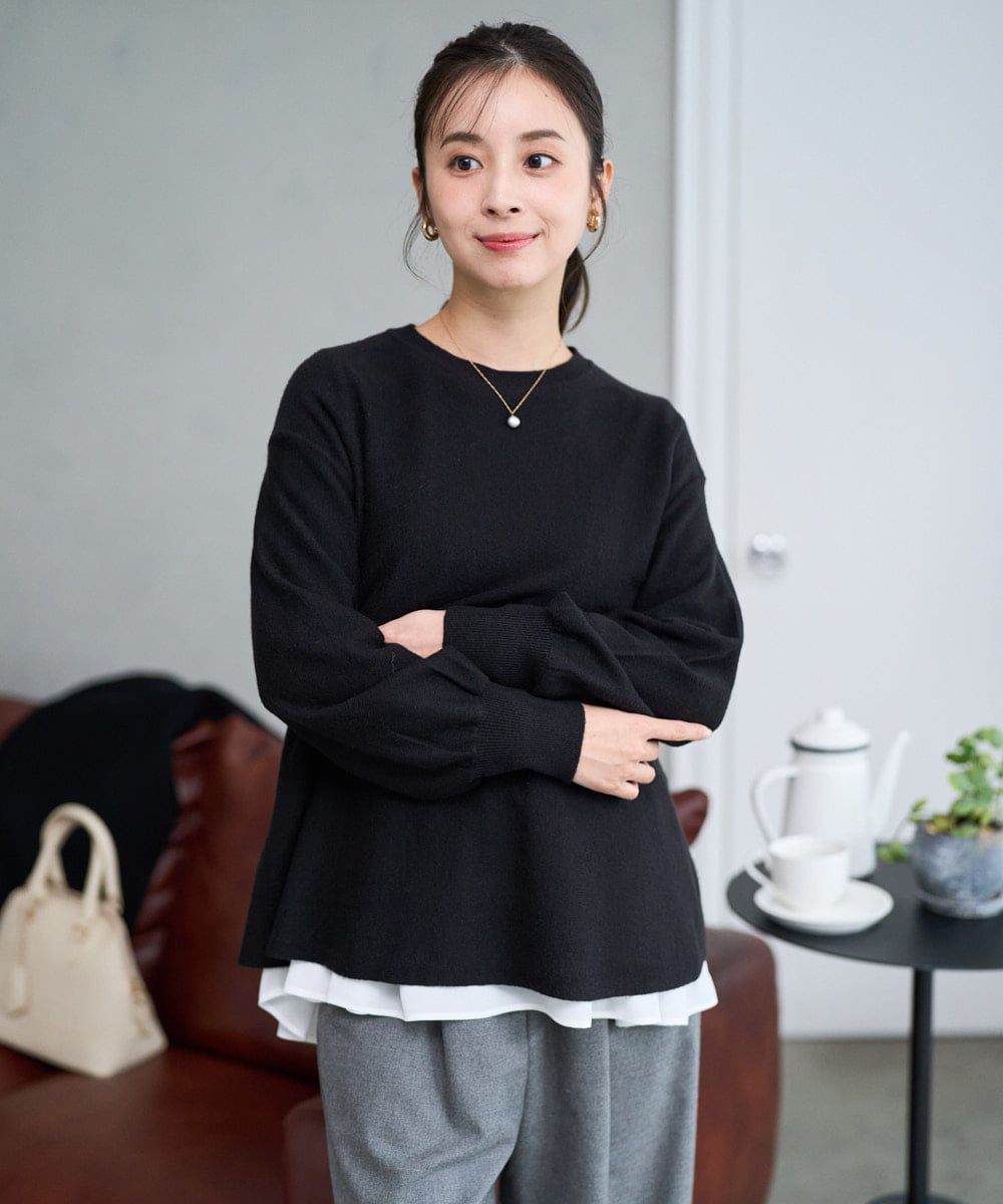 同じく、ヒップを隠す丈感のフレアーシルエットチュニックニットは、合わせやすいニットと軽いスカートと相性抜群。